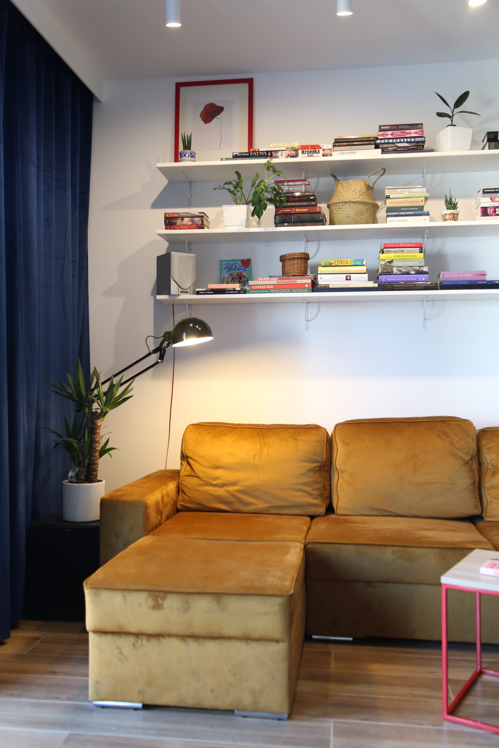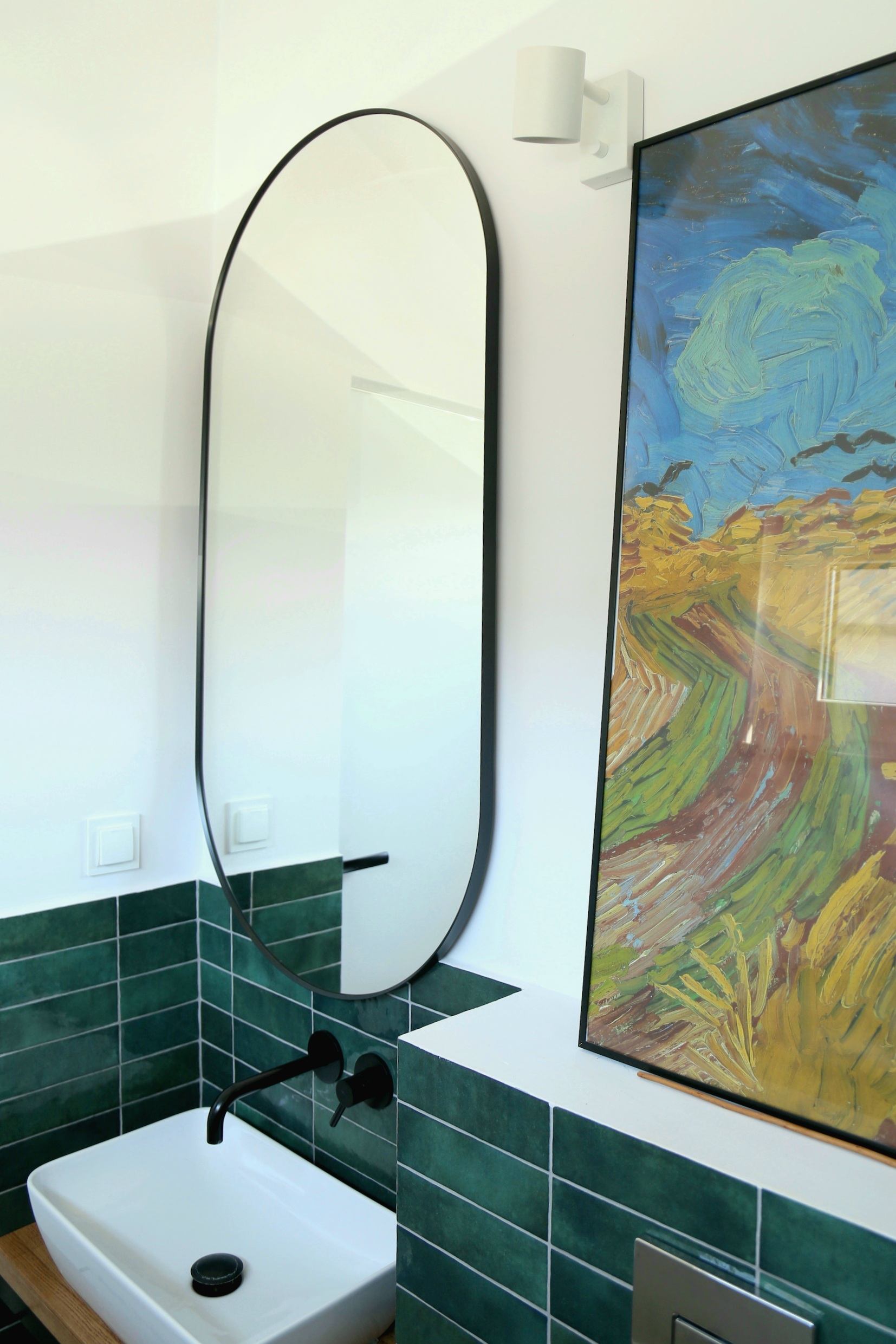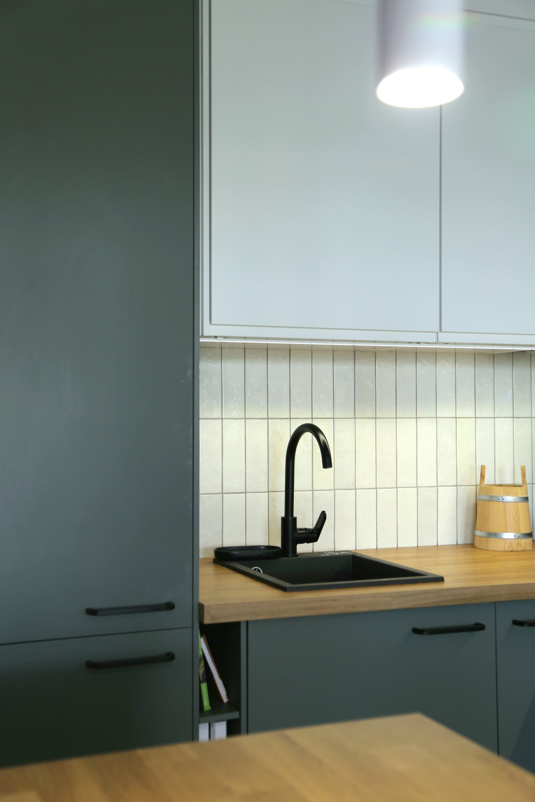 Dom szeregowy miał niedużą powierzchnie na obu piętrach. Czteroosobowa rodzina potrzebowała miejsca, które oprócz dobrej energii i kolorów pełnych życia będzie funkcjonalne i będzie sprzyjać długim rodzinnym wieczorom. W związku z niewielkim budżetem układ ścian pozostał bez zmian. Od samego początku mówiliśmy, że kuchnia ma być centrum domu. Otwarta na salon i jadalnie, z szafkami z frontami w dwóch kolorach sama w sobie wprowadza dobrą energię do przestrzeni. W kuchni i dwóch łazienkach zostały zastosowane kafelki cegiełki w dwóch wersjach kolorystycznych. W całym domu użyta została czarna armatura firmy Omnires, która jest spójna z dodatkami, lustrami i uchwytami w szafach.
