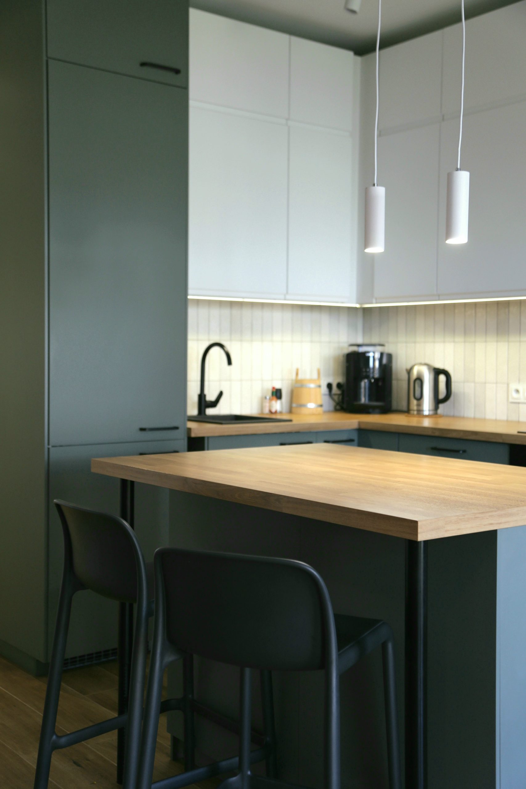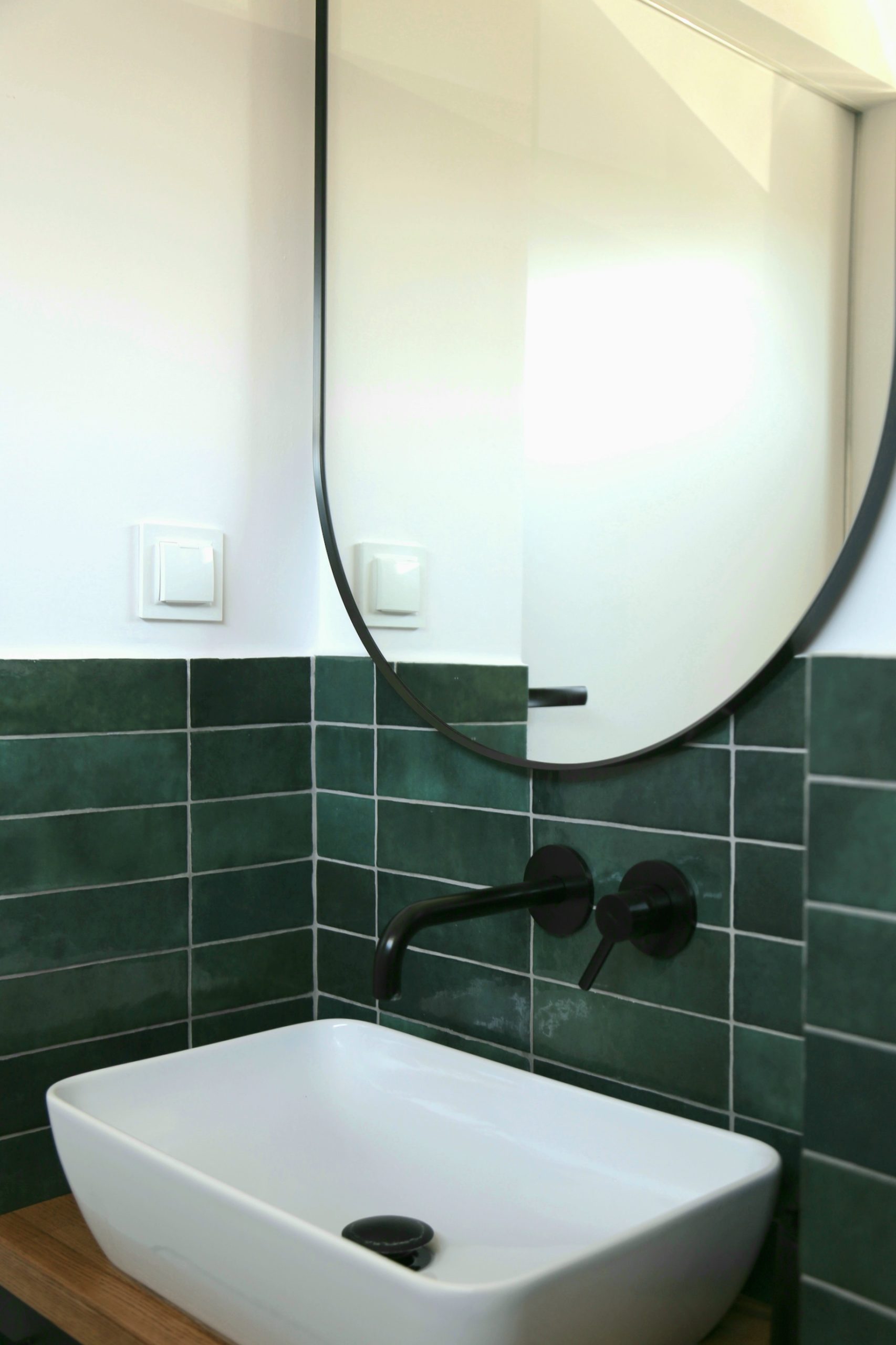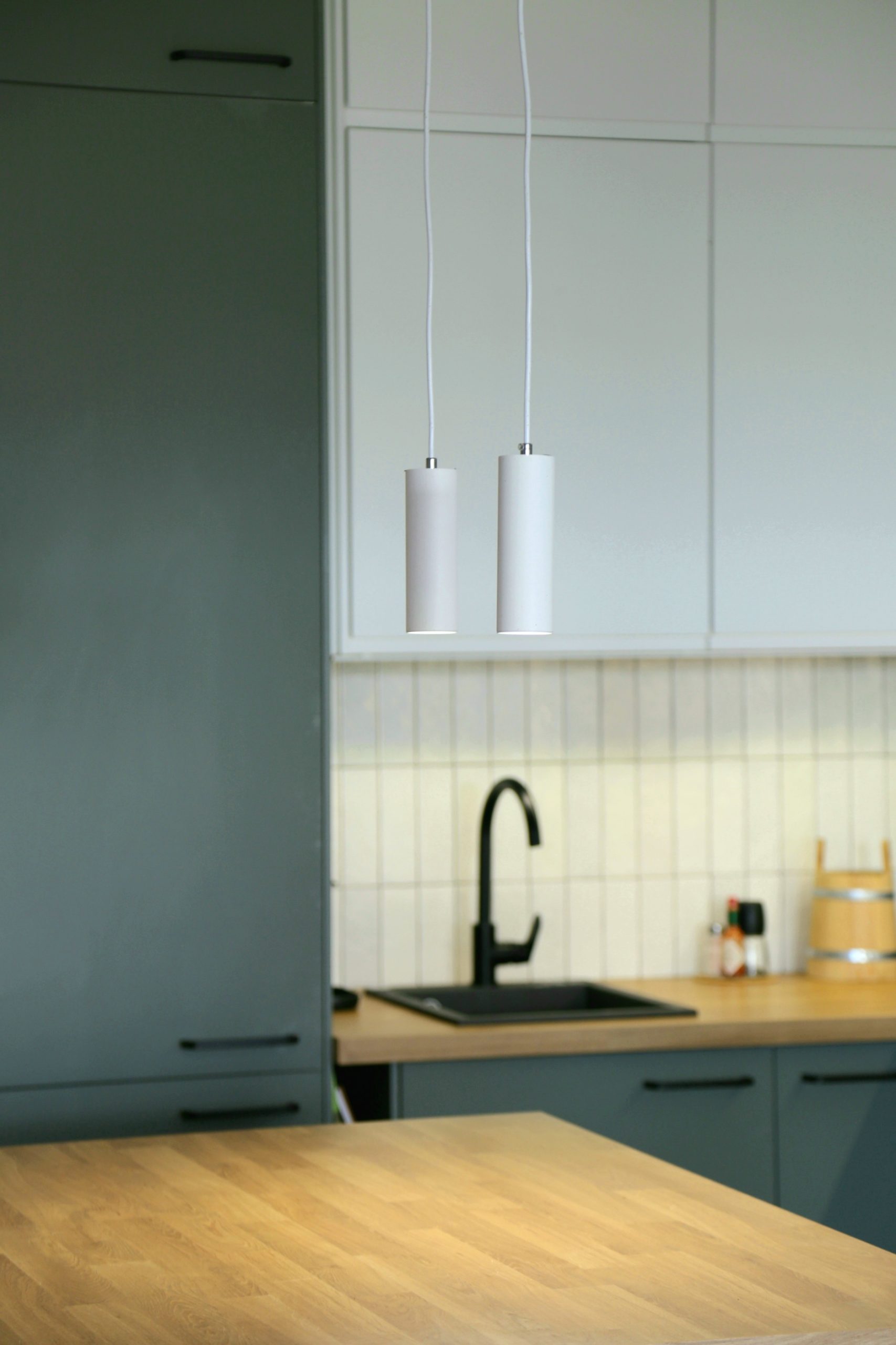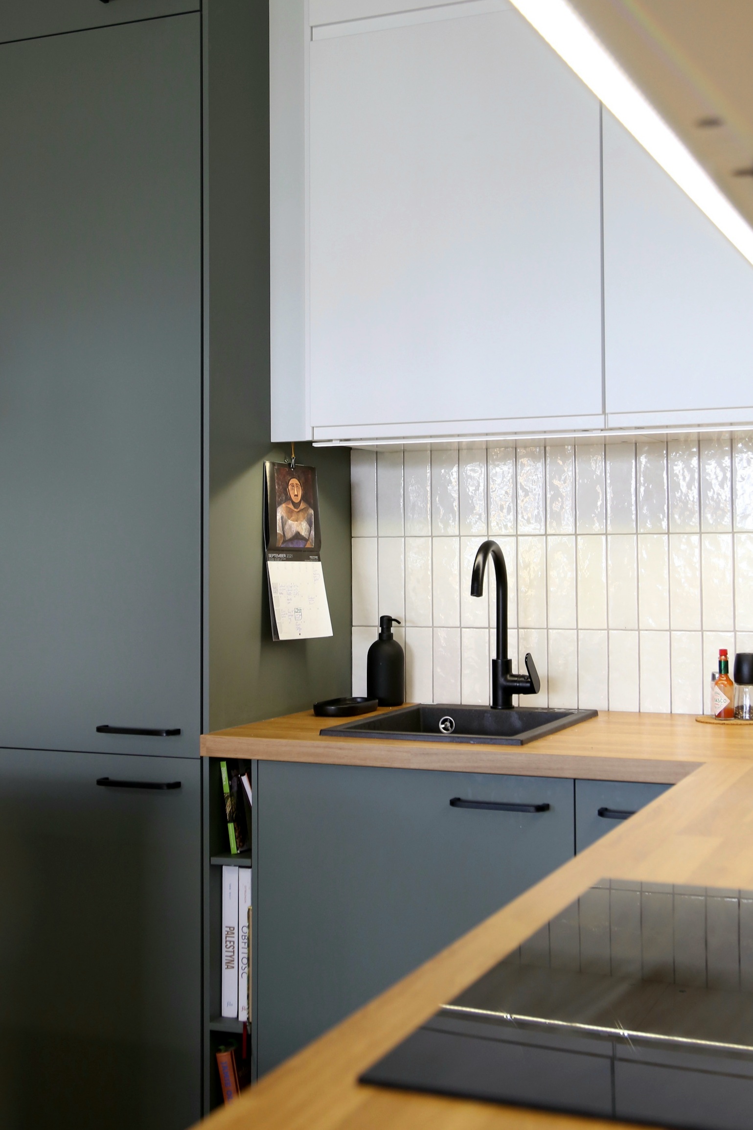 Dom szeregowy miał niedużą powierzchnie na obu piętrach. Czteroosobowa rodzina potrzebowała miejsca, które oprócz dobrej energii i kolorów pełnych życia będzie funkcjonalne i będzie sprzyjać długim rodzinnym wieczorom. W związku z niewielkim budżetem układ ścian pozostał bez zmian. Od samego początku mówiliśmy, że kuchnia ma być centrum domu. Otwarta na salon i jadalnie, z szafkami z frontami w dwóch kolorach sama w sobie wprowadza dobrą energię do przestrzeni. W kuchni i dwóch łazienkach zostały zastosowane kafelki cegiełki w dwóch wersjach kolorystycznych. W całym domu użyta została czarna armatura firmy Omnires, która jest spójna z dodatkami, lustrami i uchwytami w szafach.